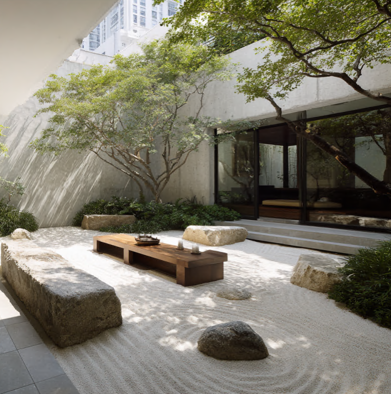 Conexión: el jardín zen actúa como un puente entre el hogar y la naturaleza, incluso en un entorno totalmente urbano.