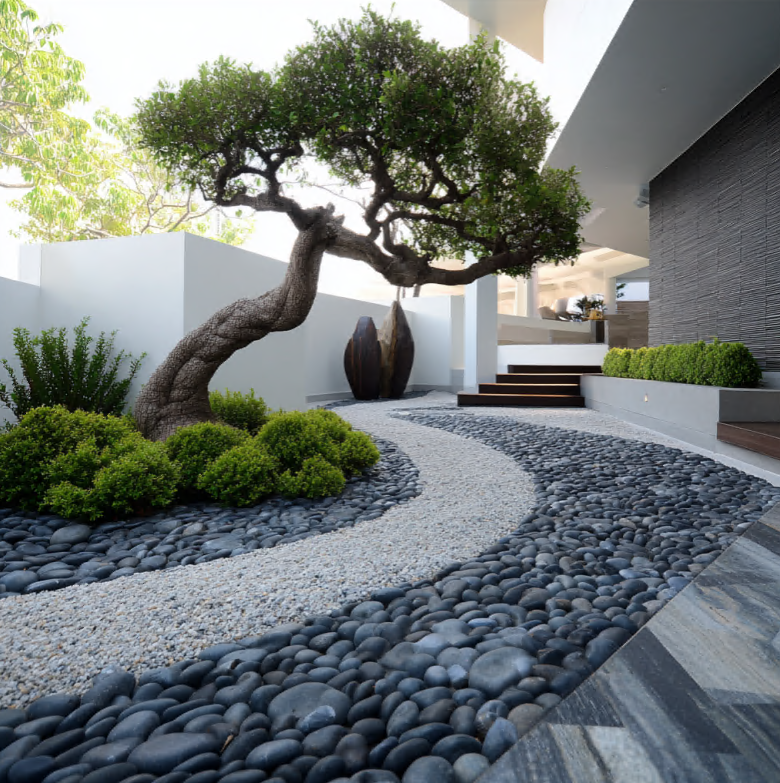 Grava y arena: se suele optar por gravilla de cuarzo o caliza de tonalidades claras, que reflejan la luz y resisten las altas temperaturas sin degradarse rápidamente. La grava debe tener el tamaño y la textura adecuados para permitir el rastrillado.